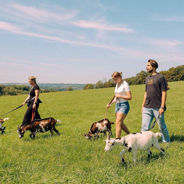 Während der Wanderung führen die Ziegen die Gruppe oft abseits ausgetretener Pfade, sodass die Teilnehmer abgelegene und idyllische Landschaften entdecken können. Das gemächliche Tempo bei der Wanderung ermöglicht es, die Natur in vollen Zügen zu genießen, Vögel zu beobachten, Wildblumen zu bestaunen und die frische Luft einzuatmen. Außerdem bietet die Ziegenwanderung eine einzigartige Gelegenheit zur Interaktion mit den Tieren. Die Teilnehmer können die Ziegen füttern, streicheln und mehr über ihre Gewohnheiten und Bedürfnisse erfahren, was eine besondere Verbindung zwischen Mensch und Tier schafft.
